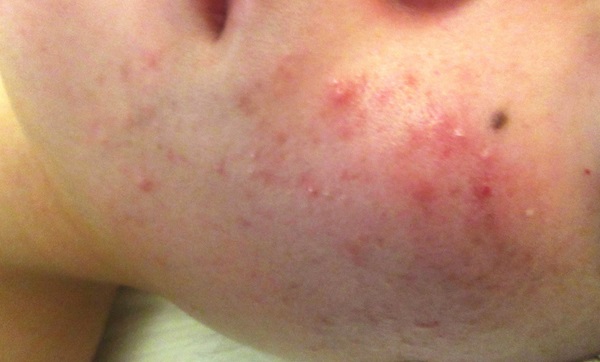 頬全体に微小面皰や白ニキビ(面皰)が多くあり、赤ニキビ(丘疹)もでている状態でした。