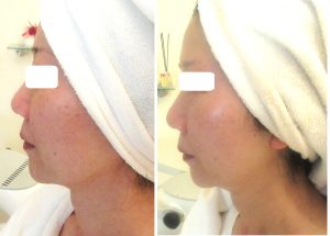 特に左側のほうれい線は右と比べて深く出ていましたが、2回目の施術でしっかりとハリが出て、目立ちにくくなっています。