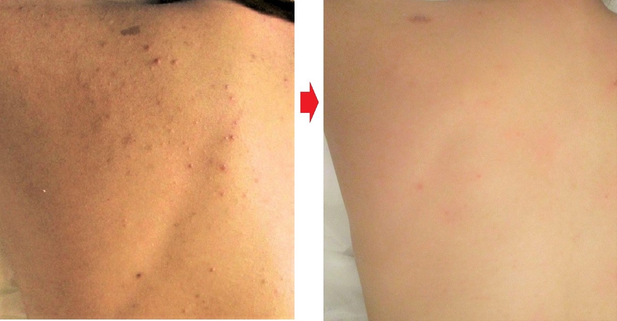 色素沈着が目立って背中全体が黒ずんだ肌でしたが、施術12回目でこれだけきれいに改善されました。